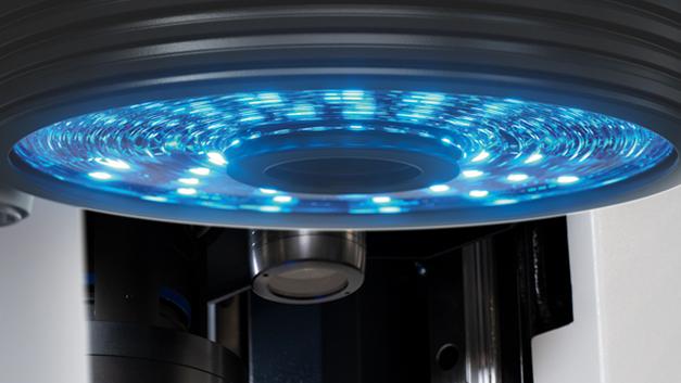 The ring light is comprised of four rings with sixteen blue and sixteen red LEDs that can be individually controlled in eight segments. Together with the synchronized optic, the color LEDs enable the operator to filter out distracting ambient light and to illuminate e.g. colored materials with a high level of contrast.