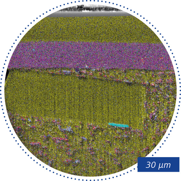 • 05 EDS element mapping of FIB-polished area; yellow: C intensity, blue: Al intensity, pink: Ti intensity, red: Si intensity.​